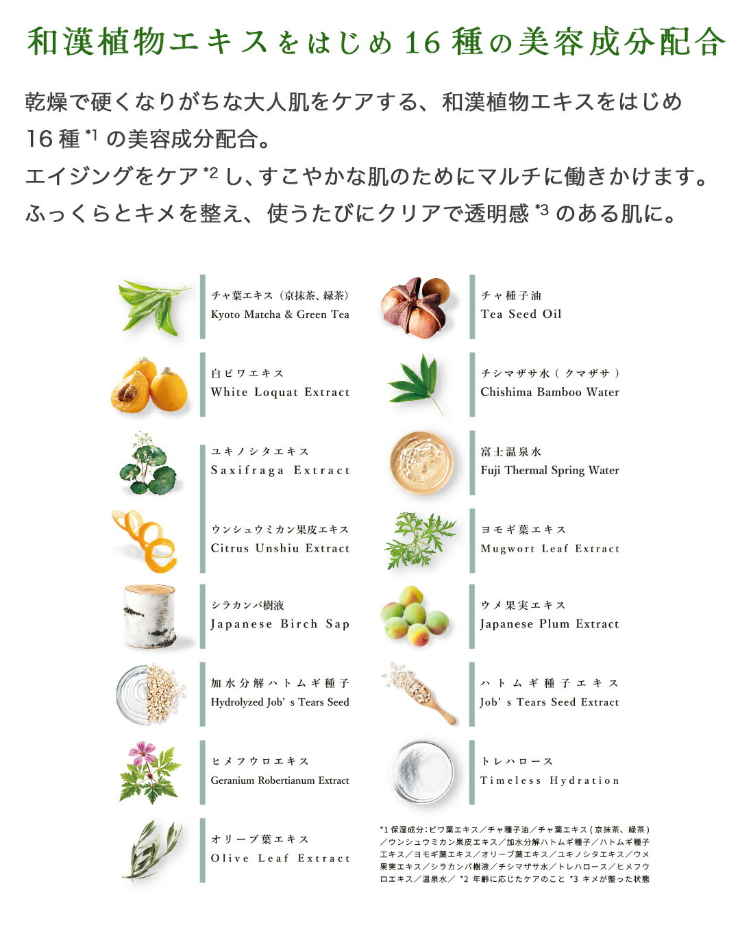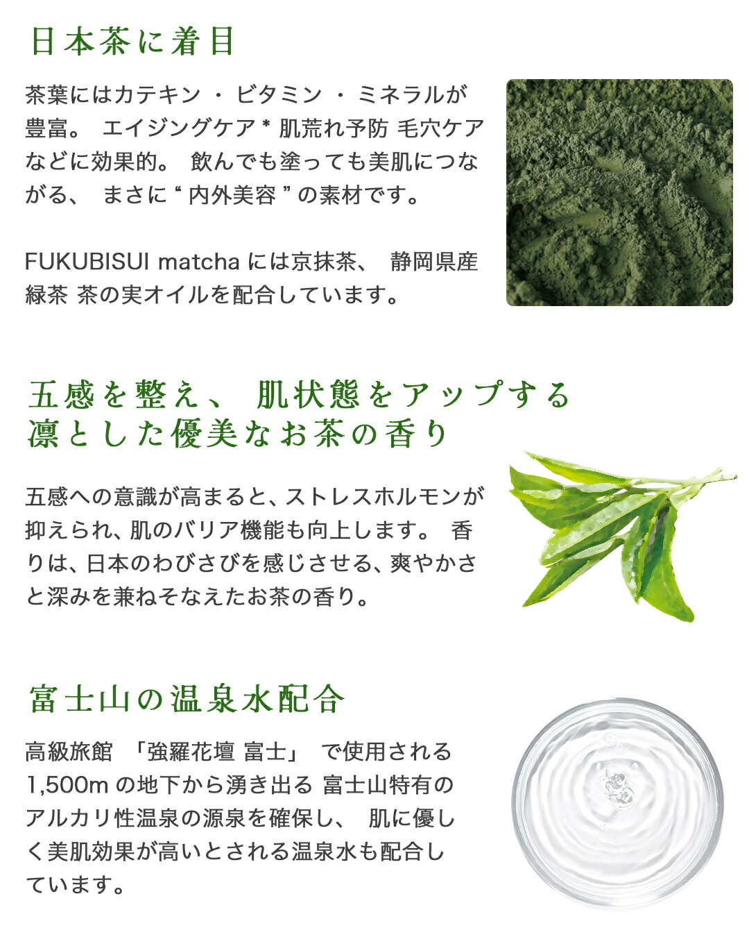 FUKUBISUI matcha シリーズは、FUKUBISUIのベーシックな理念に加え、エイジングケア*を目的として生まれました。*年齢に応じたケア